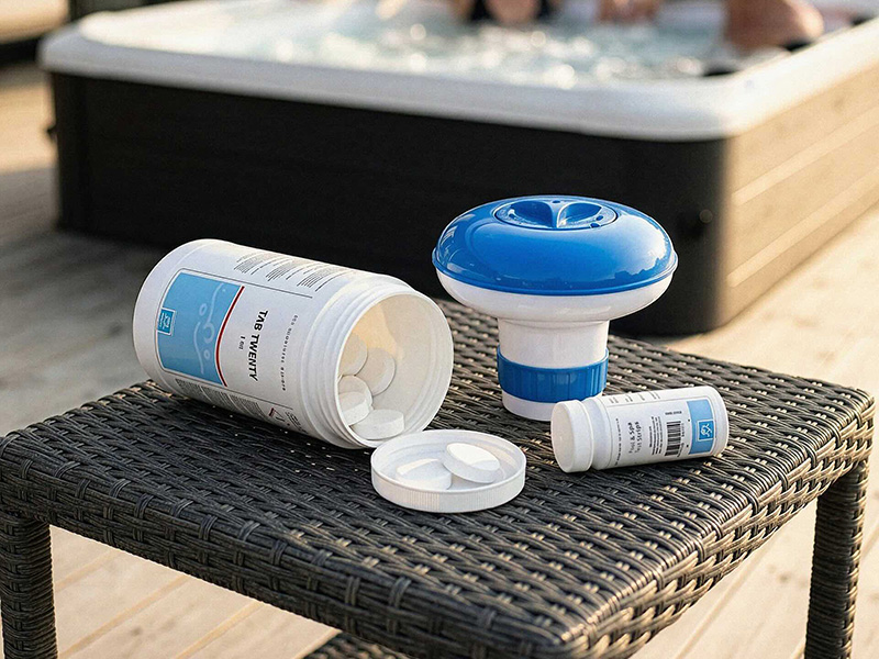Legg Tab Twenty tabletter i en flotør eller spaets innebygde doseringsrør. Tablettene oppløses over 4-7 dager og sikrer at det hele tiden er nok klor i vannet til å fjerne eventuelle bakterier.